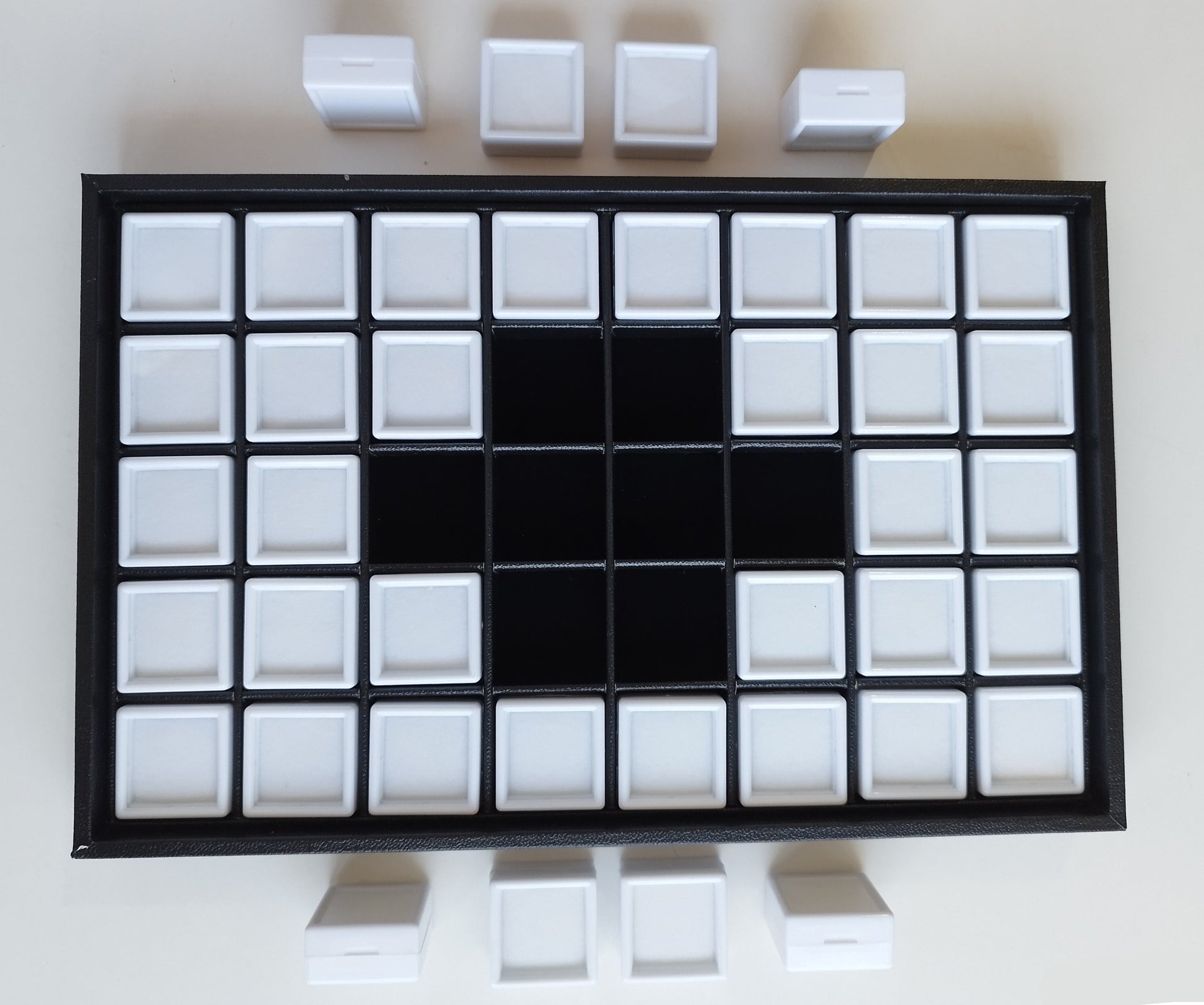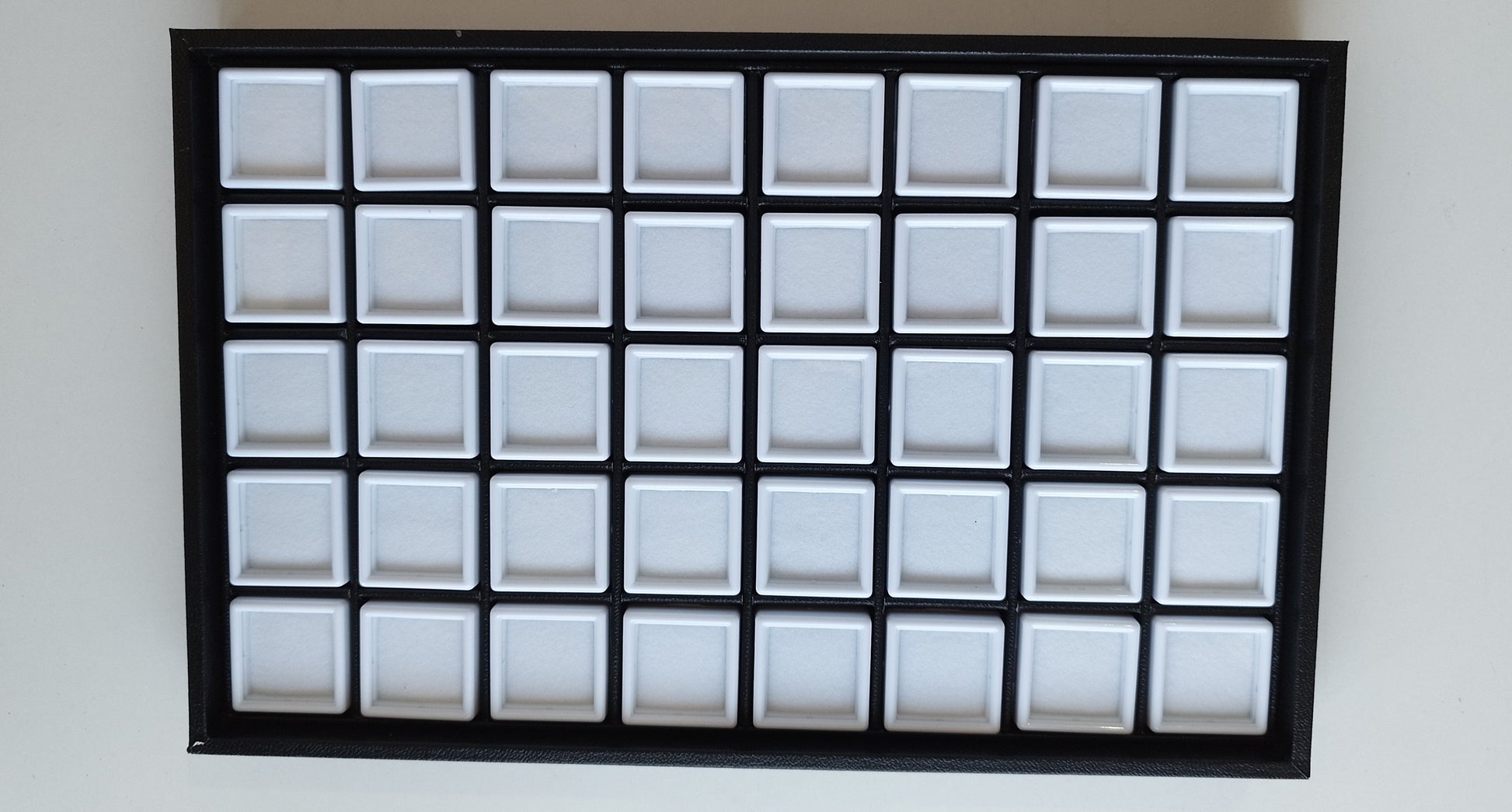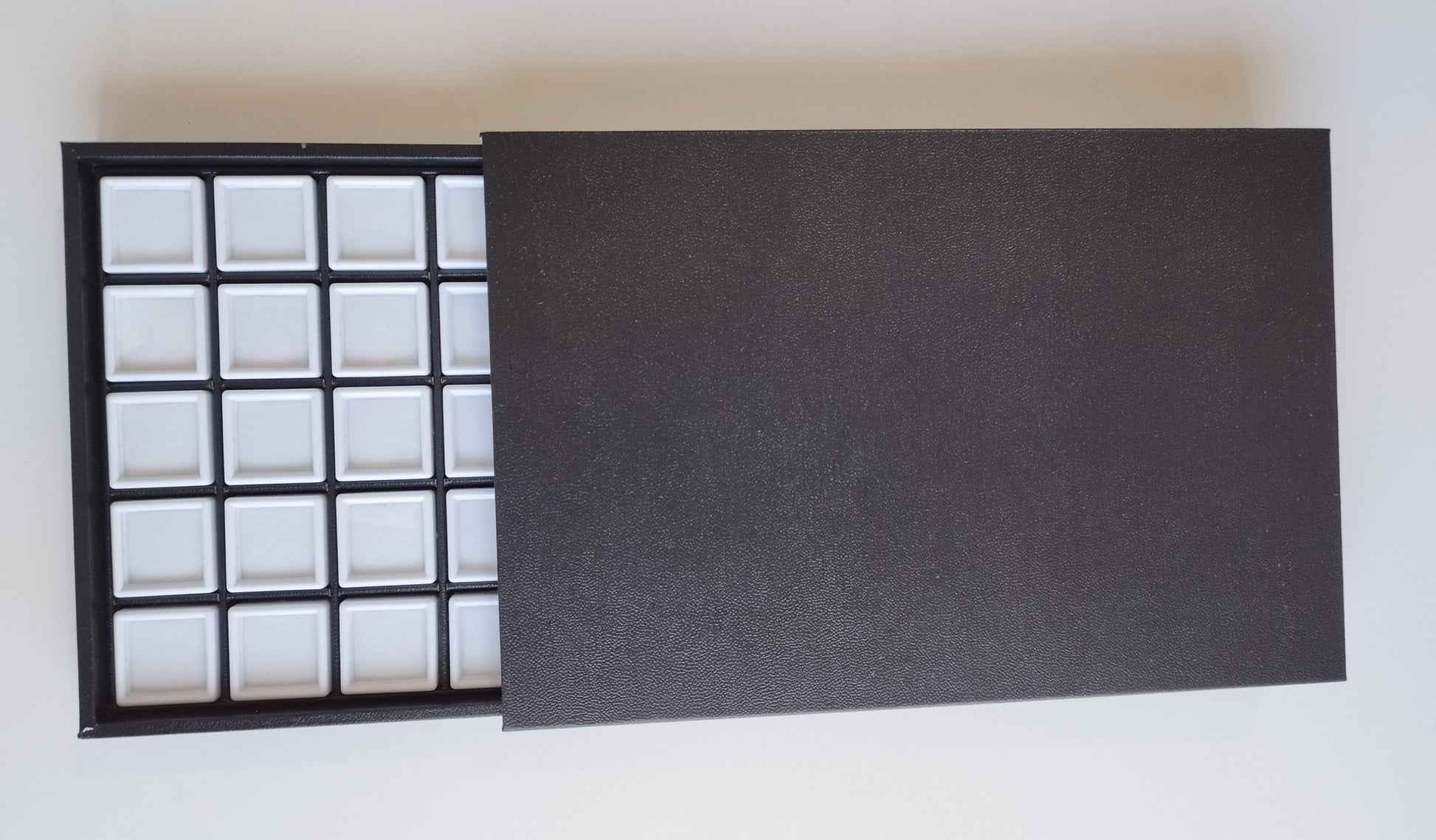 Suede-covered lid. Contains 40 square white plastic boxes of 3 cm.