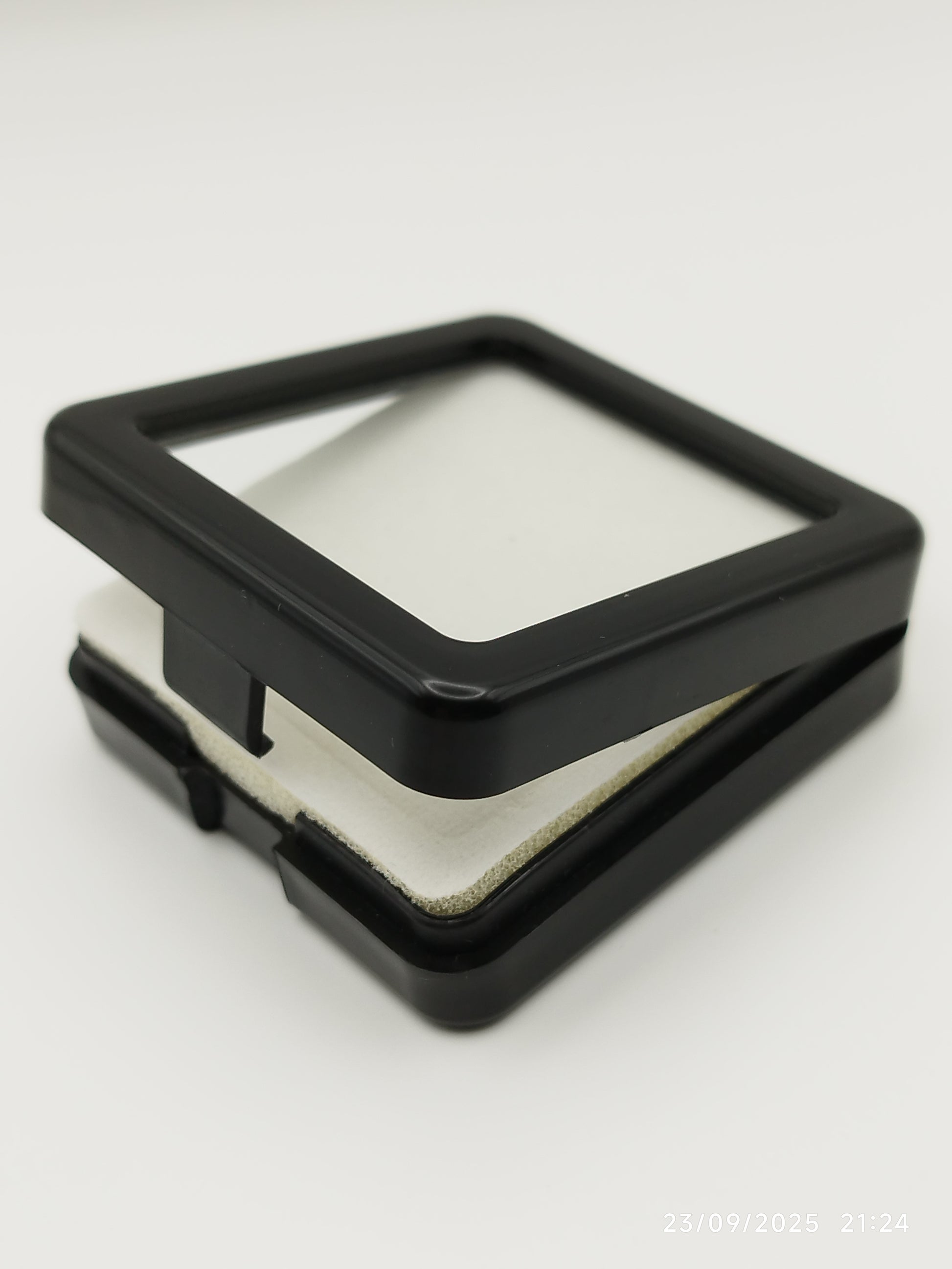Black plastic box with window and white pad (5,4 * 5,4 * 1,6 cm)