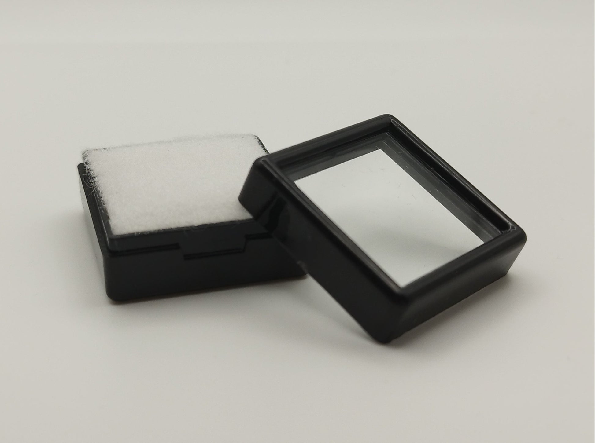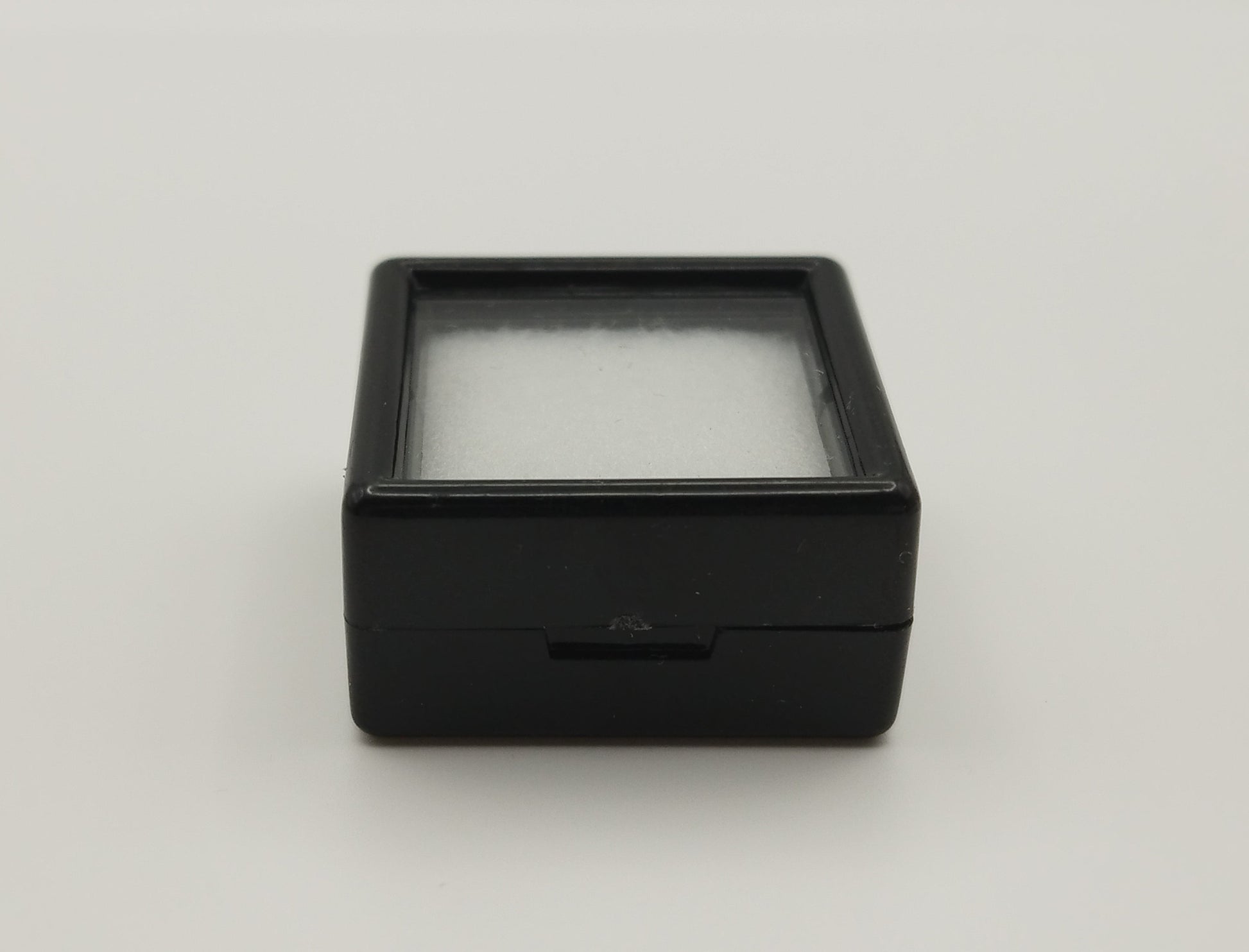 Black square plastic box with window and white pad (3 * 3 * 1,5 cm)