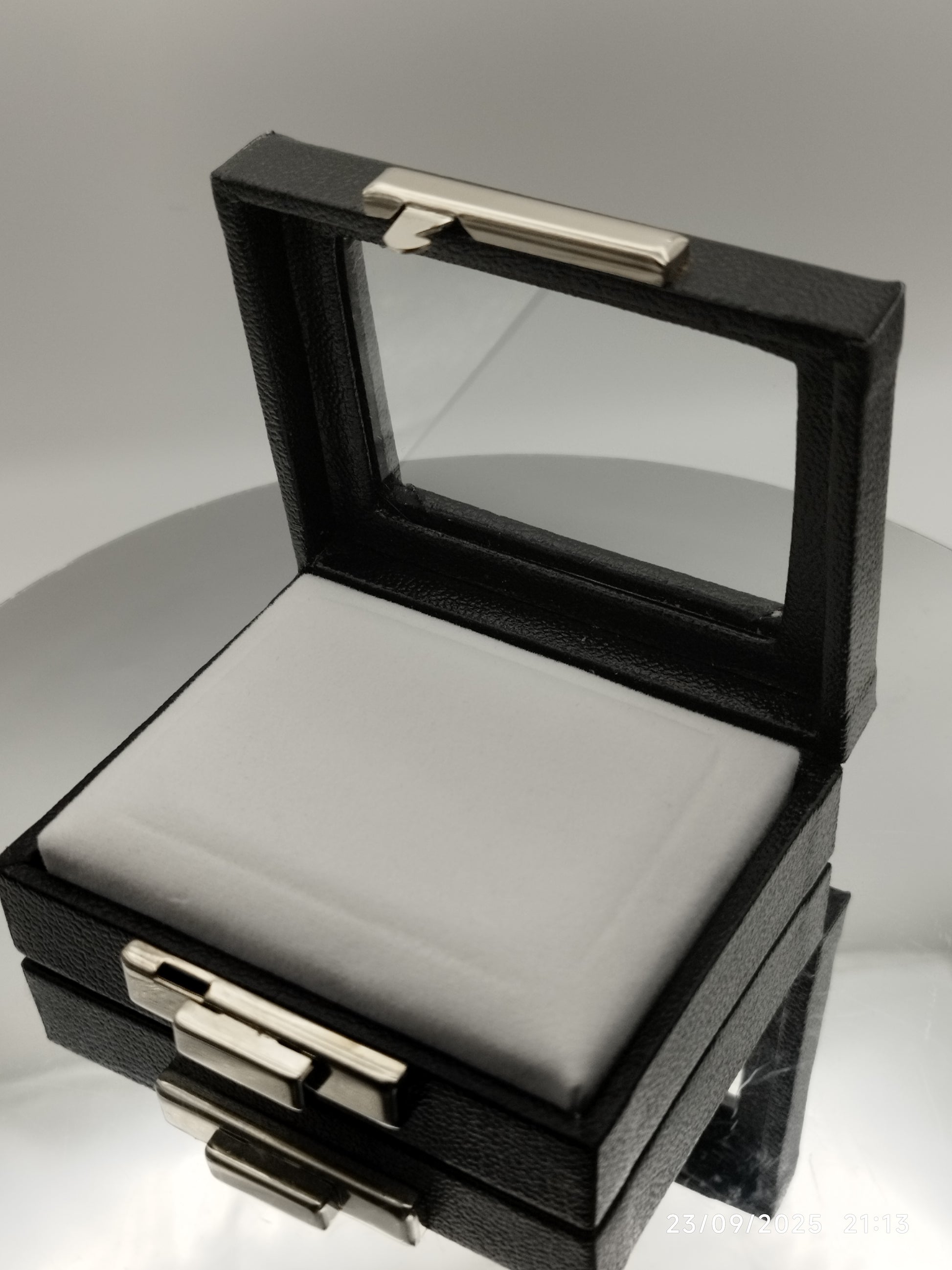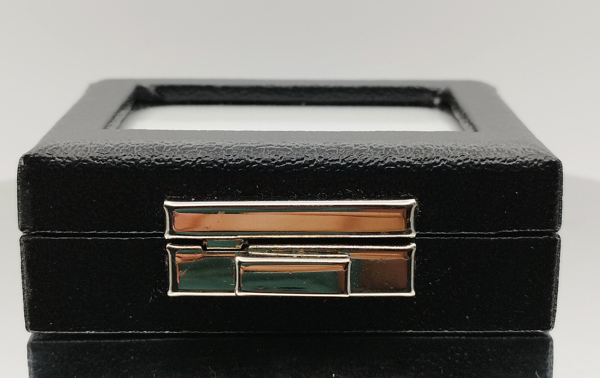 Leather-like black box with metal clasp, transparent top window, and white padded cushion.