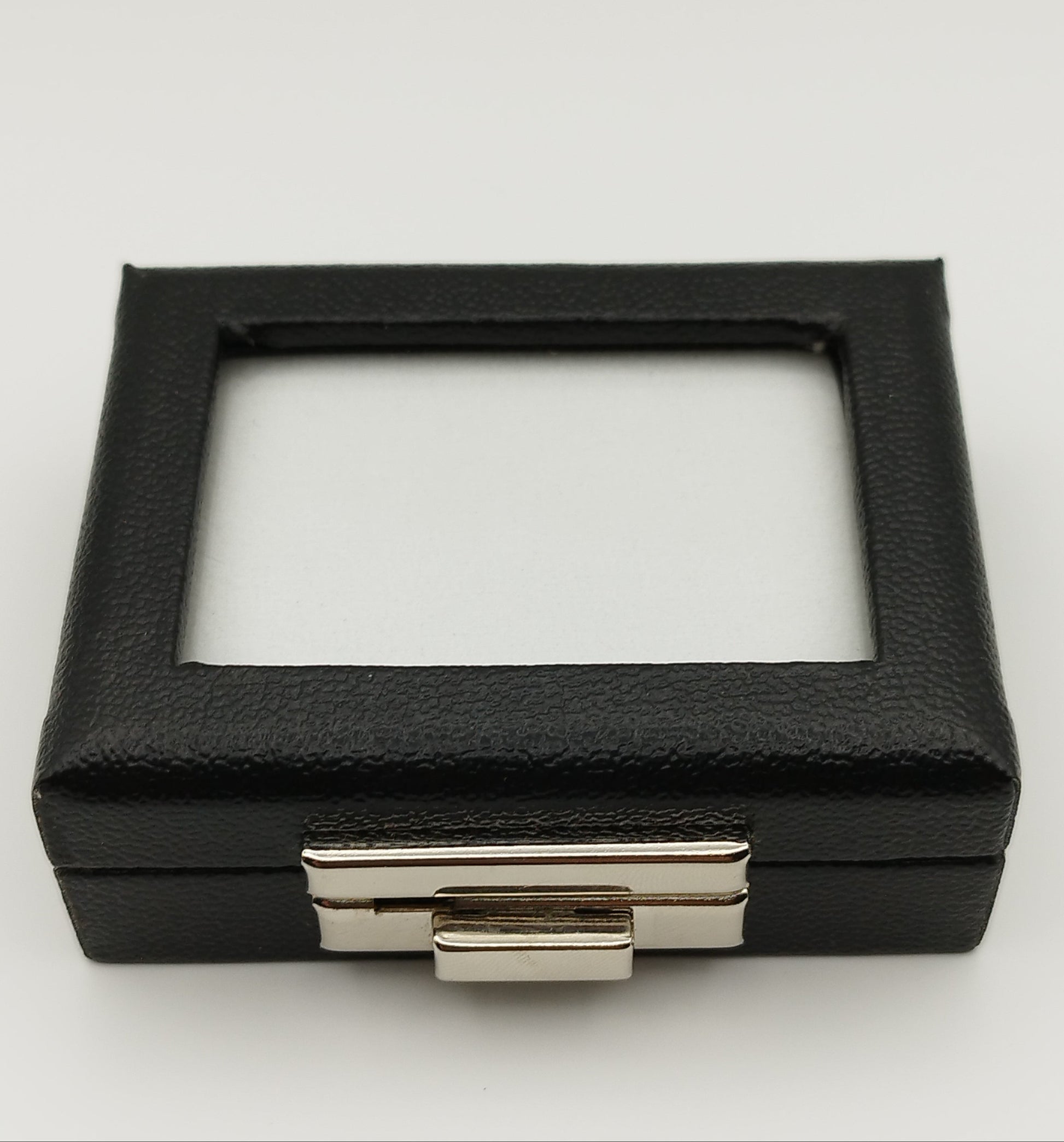 Leather-like black box with metal clasp, transparent top window, and white padded cushion. (7,5 * 6 * 2,5 cm)