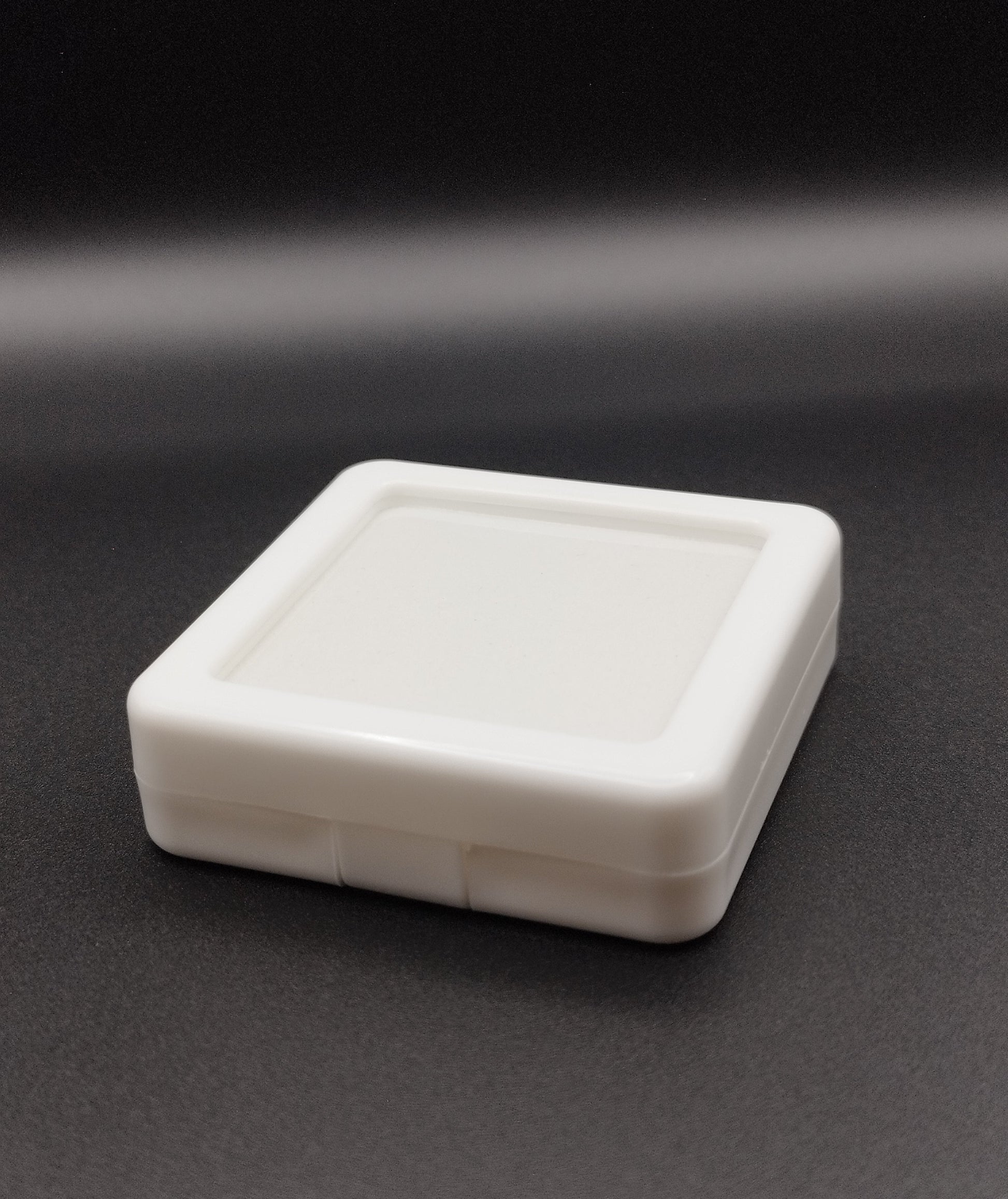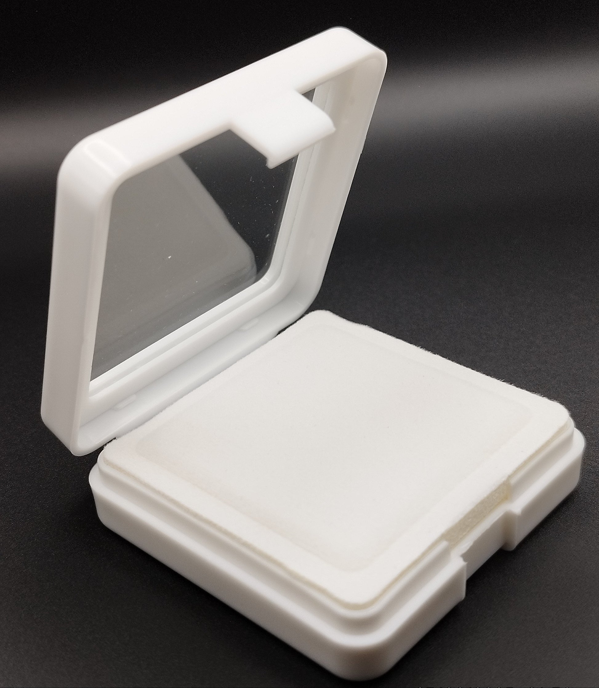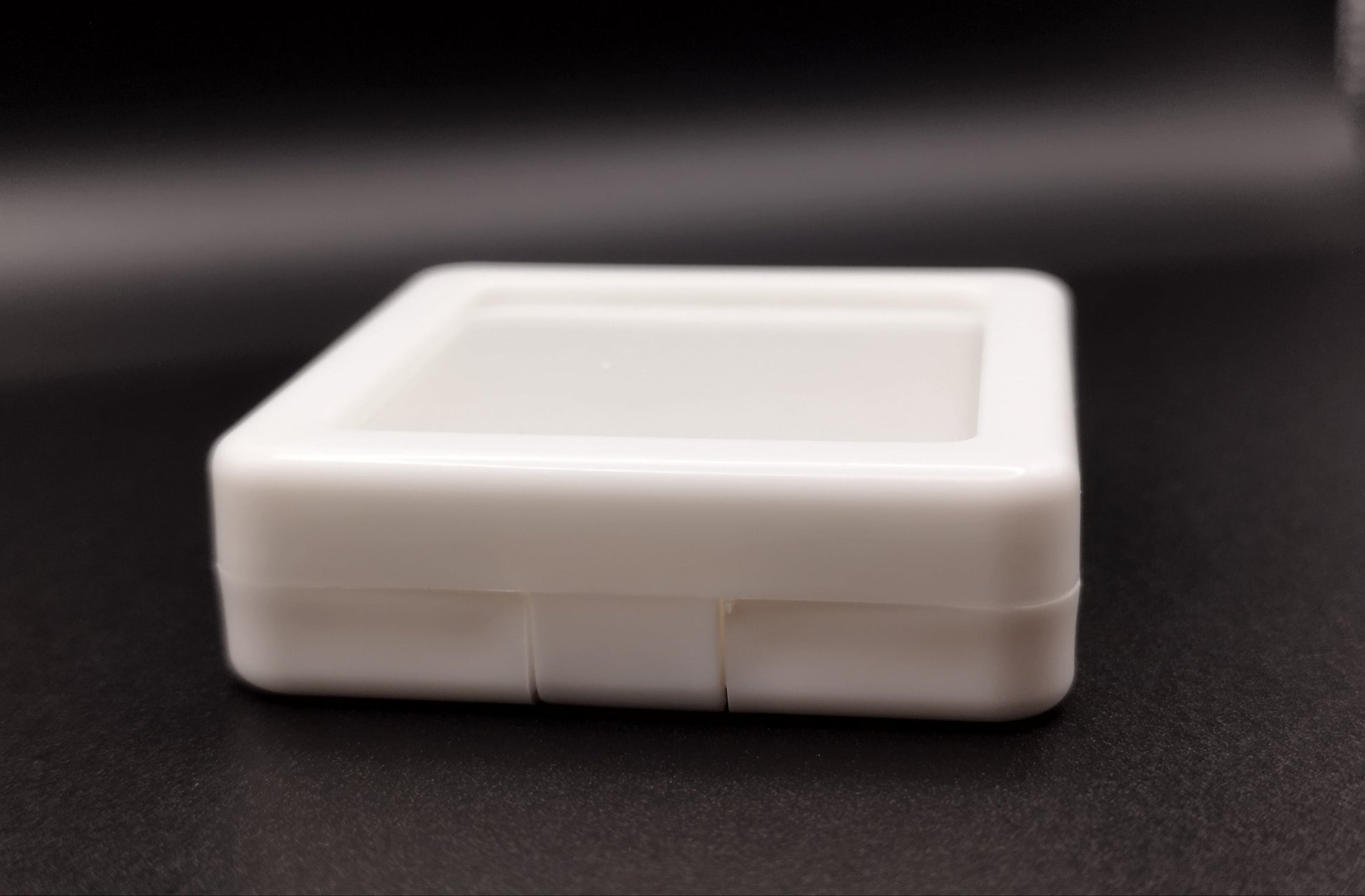 White plastic box with window and white pad (5,4 * 5,4 * 1,6 cm)