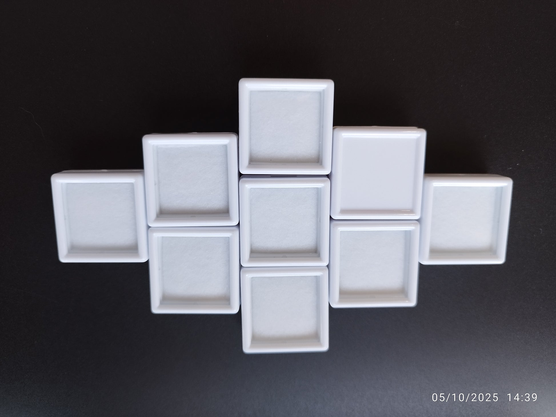 White square plastic box with window and white pad (3 * 3 * 1,5 cm)